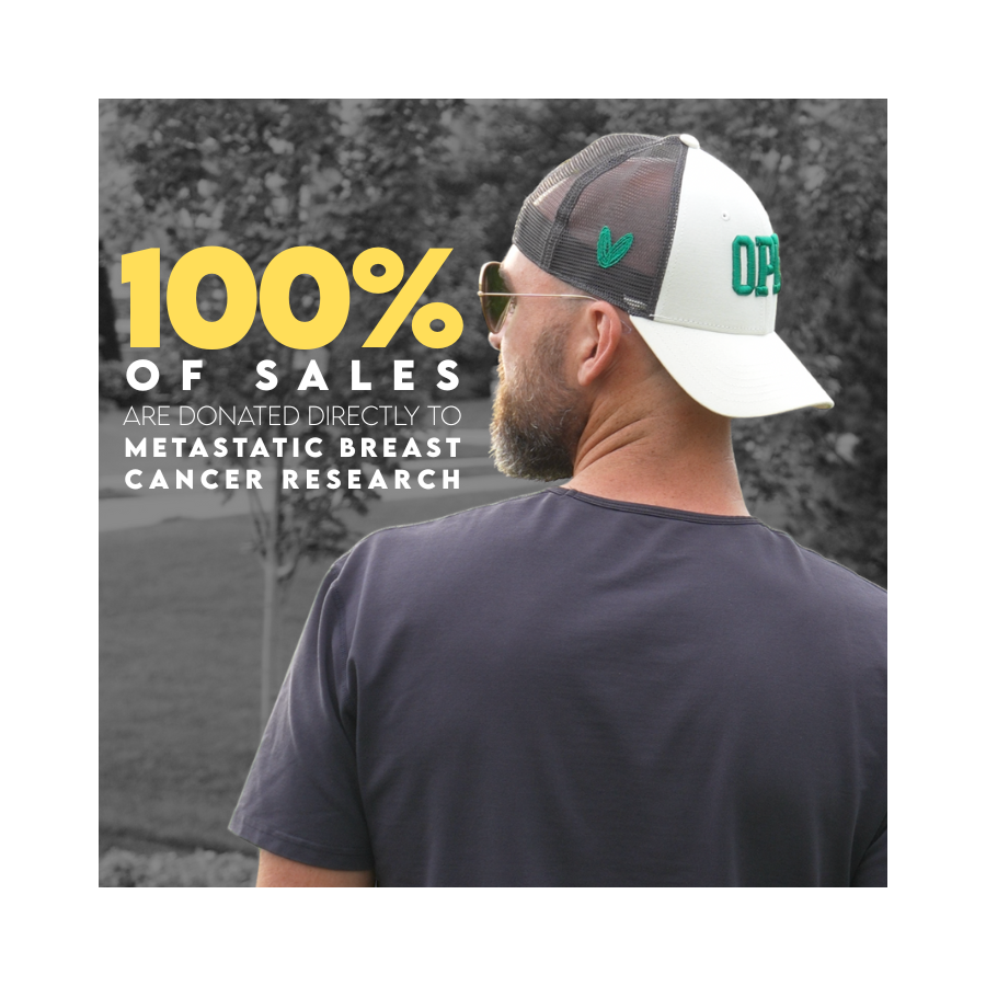 The front features bold “OPE” lettering in deep forest-green custom stitching against a cream front panel and bill for a clean, classic look. On the side, the VraniCURE logo proudly highlights our partnership in the fight against metastatic breast cancer.